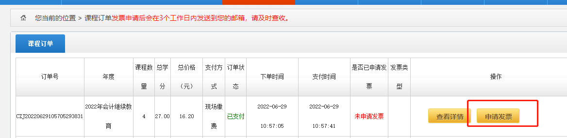 已缴费学员可到课程订单页面中申请发票,发票的申领只能在缴费当月进行,过后不能申领。点击“查看详情”,可以查看已购买的课程目录。