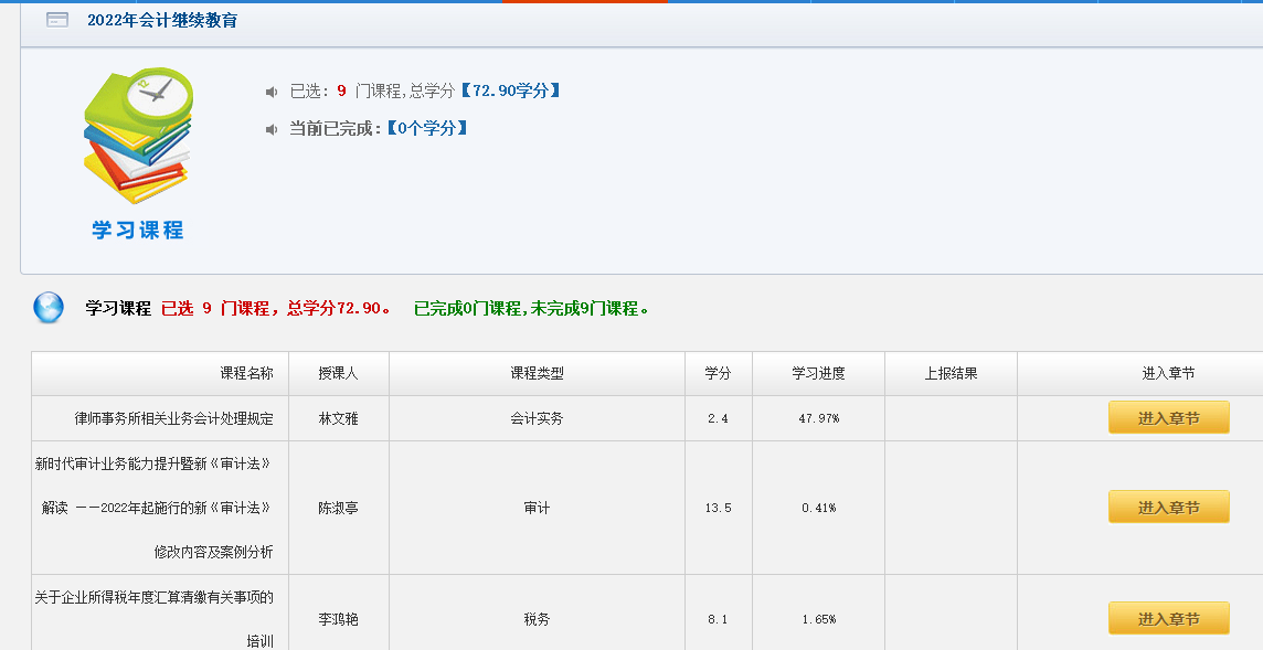 点“进入课程”显示所选的课程,在本页面会显示当前已选课程及对应学分,已完成课程和未完成课程,课程的详细列表。