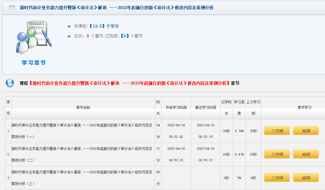 进入章节列表后,页面跳转到本课程的详细内容页,显示本课程的课程名称,课程时长,开始学习时间,最近学习时间,已学时长,学习进度,上次学习到,本课程分为几个章节以及观看方式等内容。
