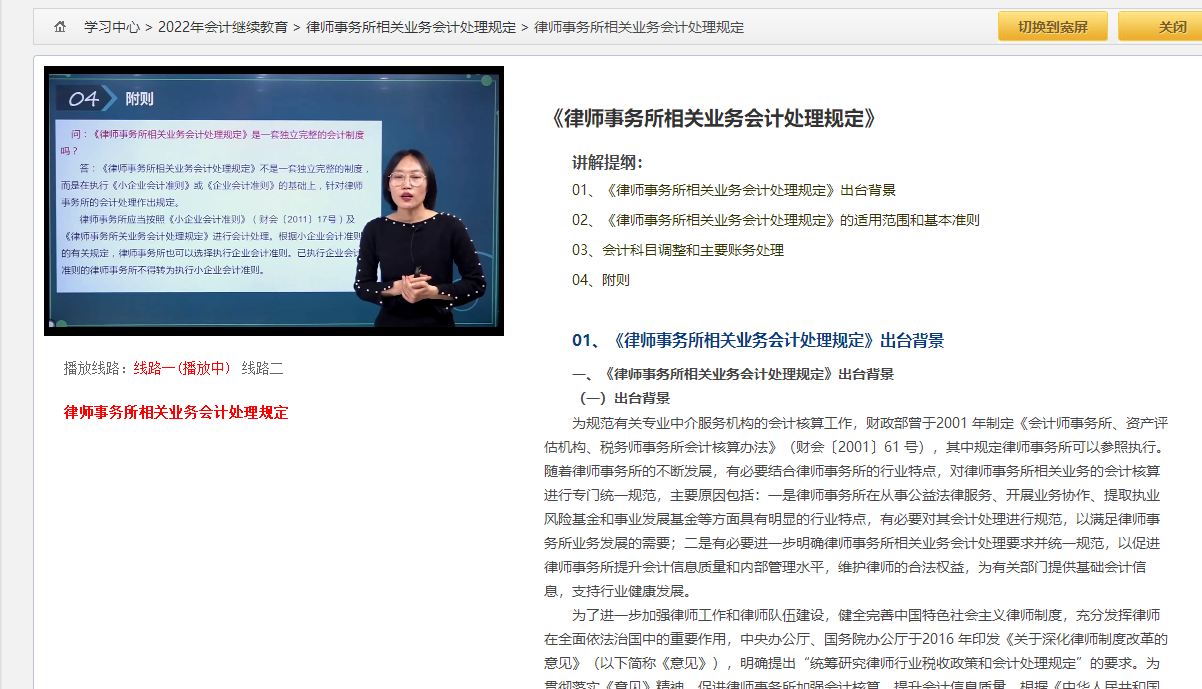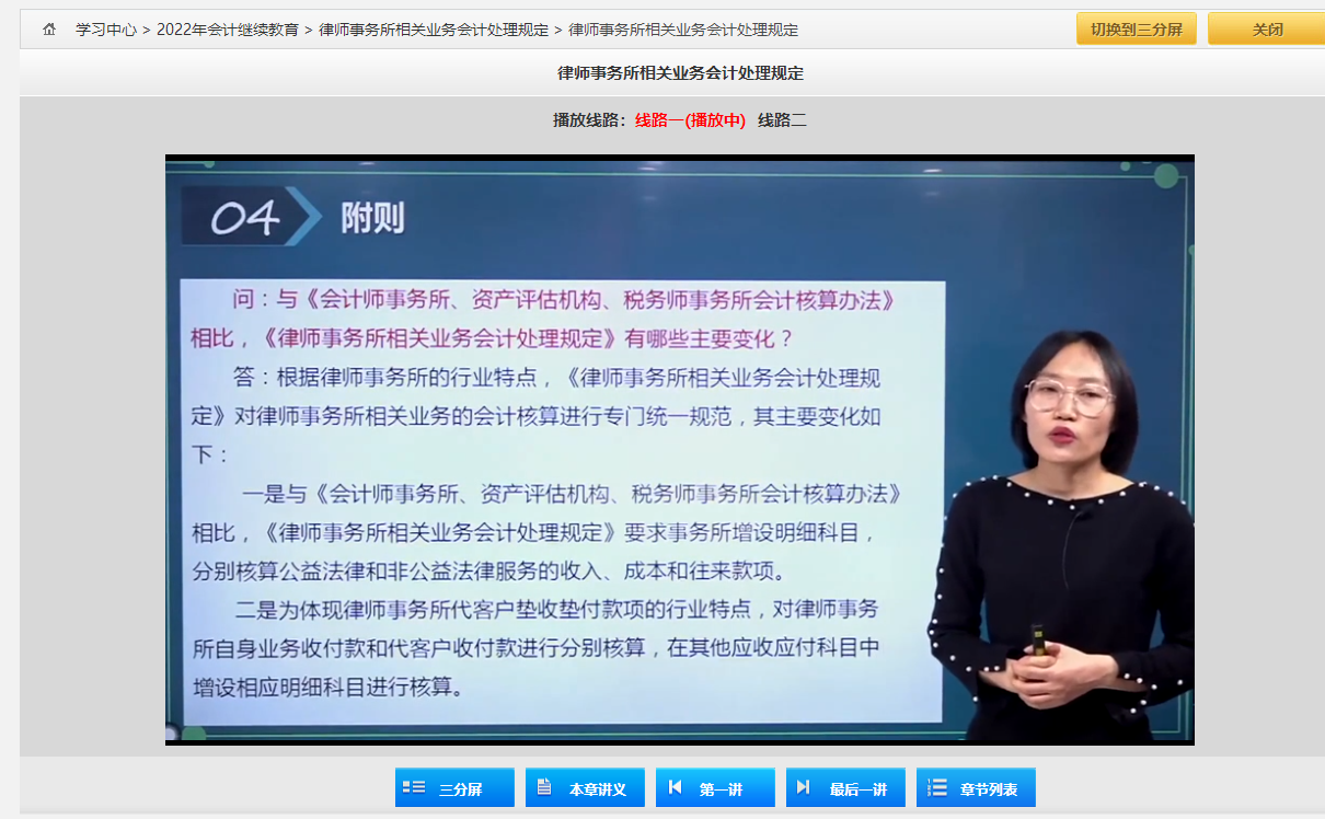 学员可以很据自己的带宽情况,选择“三分屏”或者“宽屏”进入学习。选择章节练习,可进入在线练习页面。三分屏能够和讲义对照,建议大家优先选用三分屏学习。