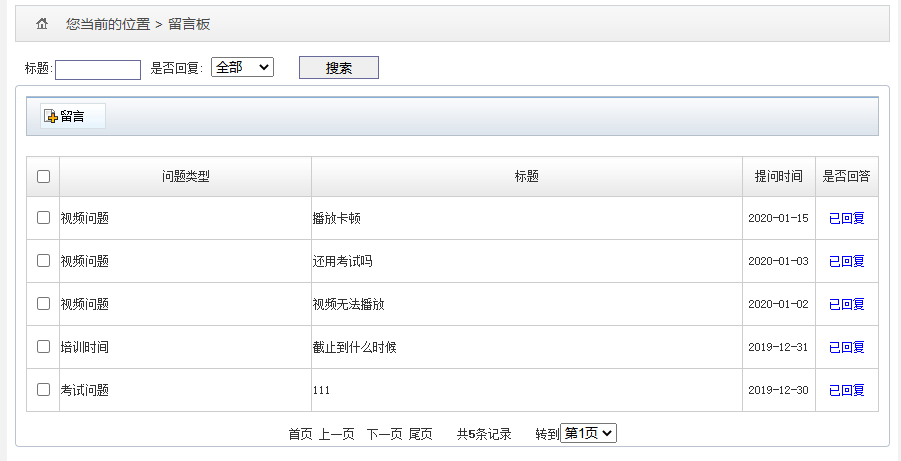 点击左侧菜单“留言板”,右侧展示留言列表,以及各留言的回复情况。