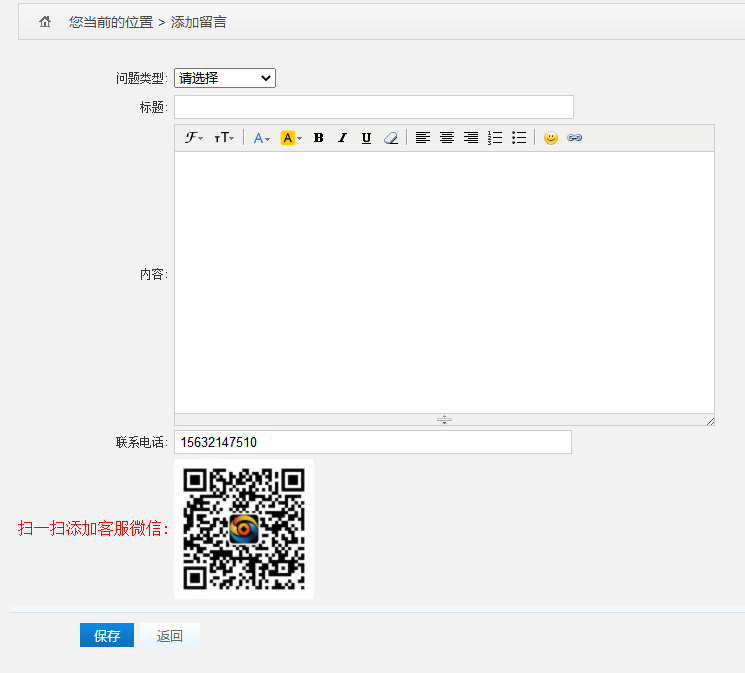 点击“留言”按钮,可以提交留言。选择问题类型、标题、留言内容、联系电话进行留言。也可扫描二维码添加客服微信。